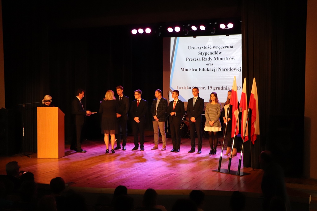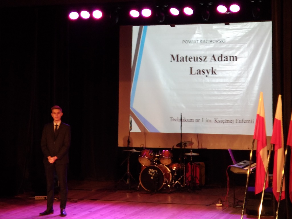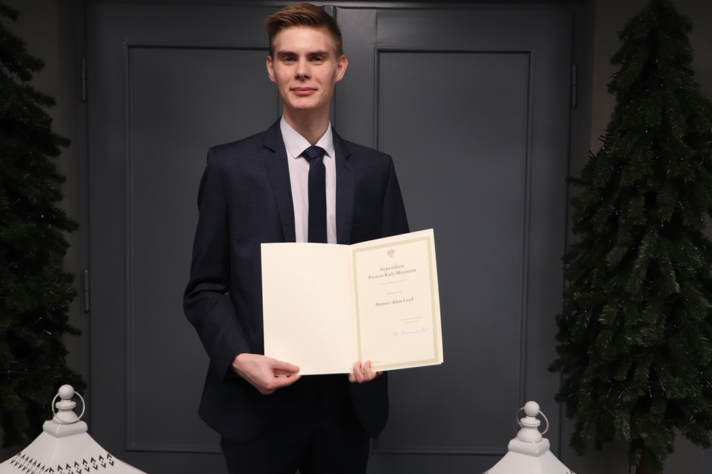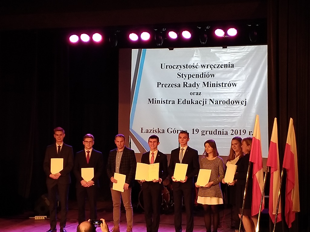 Mateusz Lasyk, uczeń klasy 3f naszej szkoły, 19 grudnia odebrał stypendium Prezesa Rady Ministrów z rąk Alicji Bartkowiak, dyrektor rybnickiej delegatury Kuratorium Oświaty.